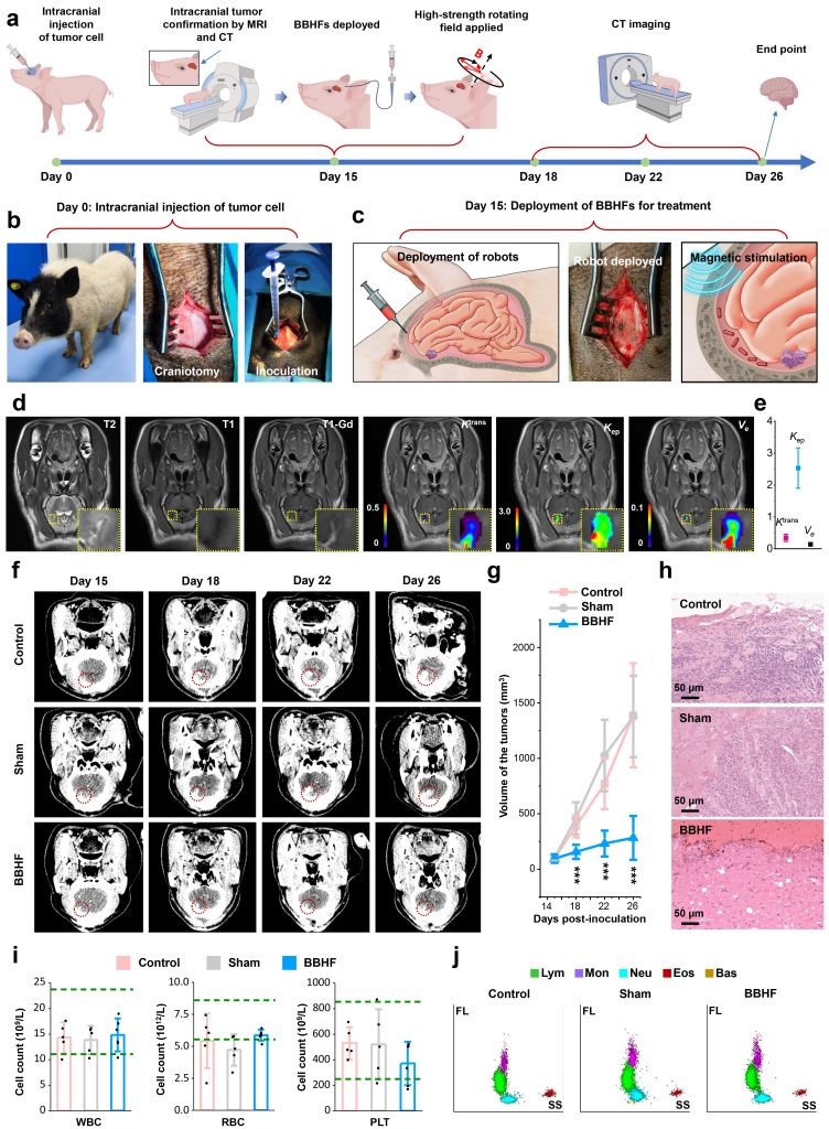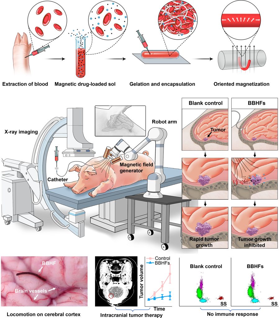 In vivo intracranial tumour therapy in pigs using the magnetically driven blood hydrogel fibre robots.
