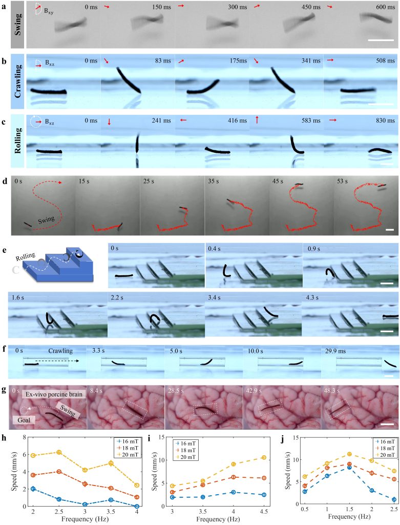 Multimodal locomotion of the magnetically driven blood hydrogel fibre robots.